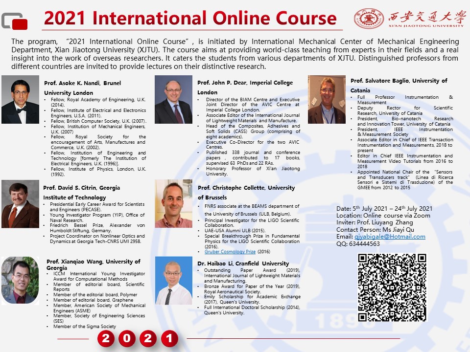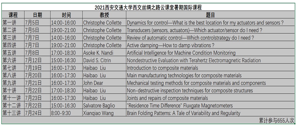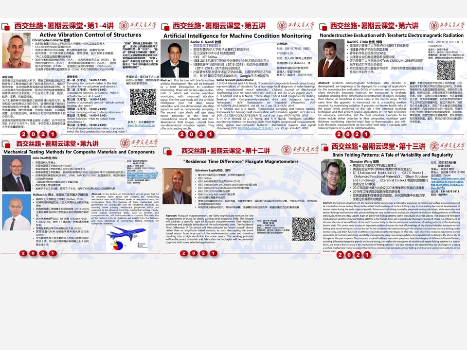 国际机械中心举办的2021西安交通大学西交丝路云课堂暑期国际课程于2021年7月24日圆满落幕,该课程共13讲,内容涵盖了振动主动控制、人工智能故障诊断、太赫兹检测、结构与功能性复合材料、高性能传感器设计与应用、大脑皮层褶皱结构与大脑功能耦合规律等,邀请了包括英国皇家工程院院士Asoke K. Nandi教授在内的英国、比利时、意大利、美国等7位专家学者,线上累计参与课程人数达655人次。